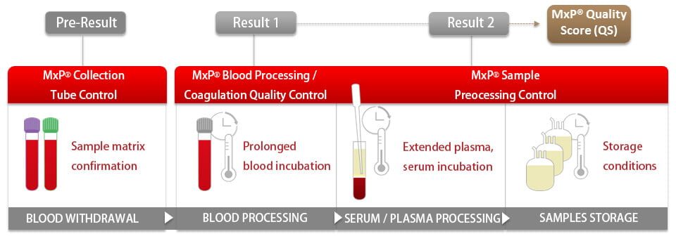 The pre-result confirms the sample matrix and the Mx P® Quality Score describes the overall sample quality regarding metabolic effects of prolonged blood and serum or plasma processing, or improper storage conditions.