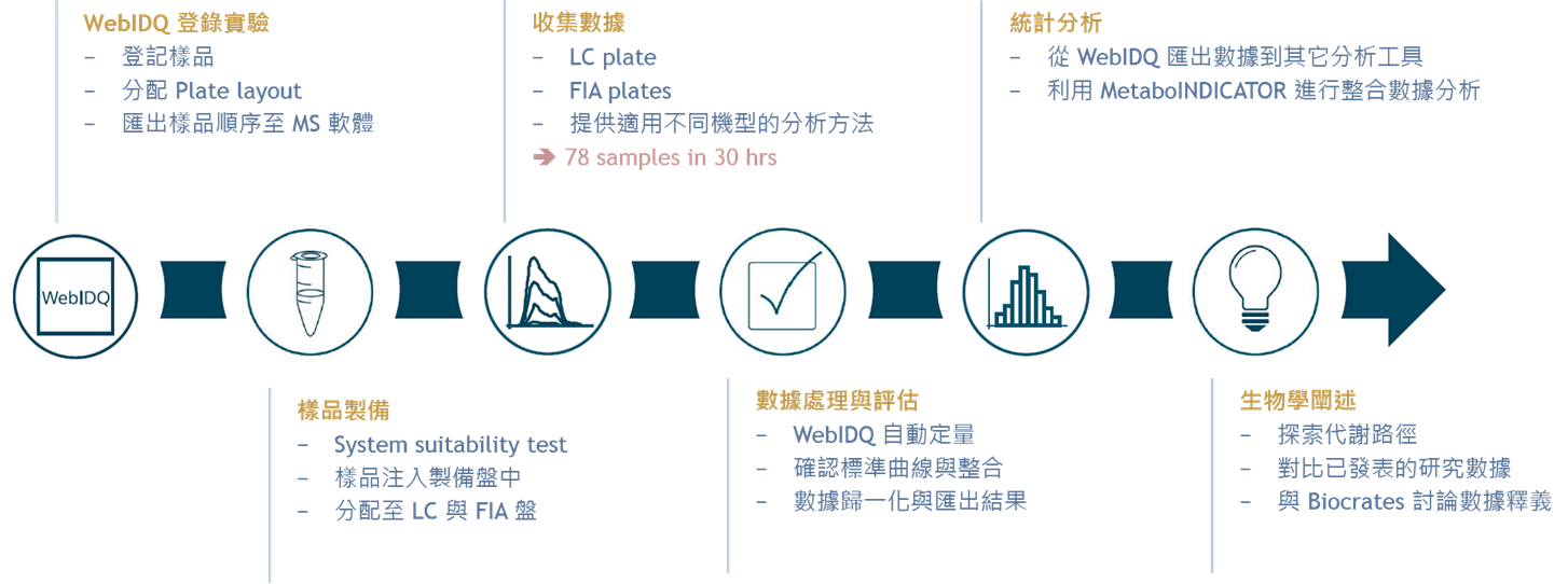 | ○ 以雲端為基礎的分析軟體 (另也提供本地版本) ○ 完整的實驗流程指引 ○ 自動定量、技術驗證與報告產出 ○ 搭配MetaboINDICATOR™提供生物學相關代謝指標 | ○ 適用質譜儀機型 (持續更新中) Agilent 6495 C|6495 B|6470 SCIEX 7500|6500+|6500|5500+|5500|4500|4000 Waters TQ-XS|TQ-S|TQ-S micro Thermo TSQ Vantage ○ 已驗證的管柱系統 ○ 兼容ultra high performance liquid chromatography (UHPLC) |
