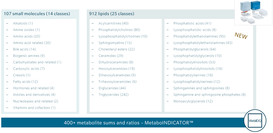 MxP® Quant 500 XL定量代謝組學分析套組,為目前市場上可分析脂質與小分子總數最多的單一套組。biocrates以標準化、品質控管和具再現性的代謝組學技術所開發的即用型試劑套組,分析標的包含1,000種以上的代謝體,涵蓋多種生化類別。提供400種以上可量化的代謝指標、涵蓋數百種代謝途徑,研究人員可藉由分析結果更全面地瞭解疾病與健康間的關係。